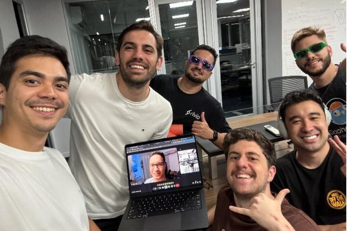 Pedro Orii (esq.) com a equipe de Tech e IA da Rivio: ambiente sempre descontraído